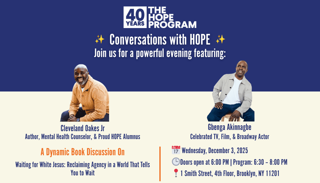 Join us on December 3rd for Conversations with HOPE, featuring HOPE alum Cleveland Oakes Jr. in conversation with acclaimed actor Gbenga Akinnagbe (The Wire, The Deuce) about his book, Waiting for White Jesus! This intimate discussion will explore the book’s themes of resilience, personal transformation, and faith. We invite you to be part of this […]